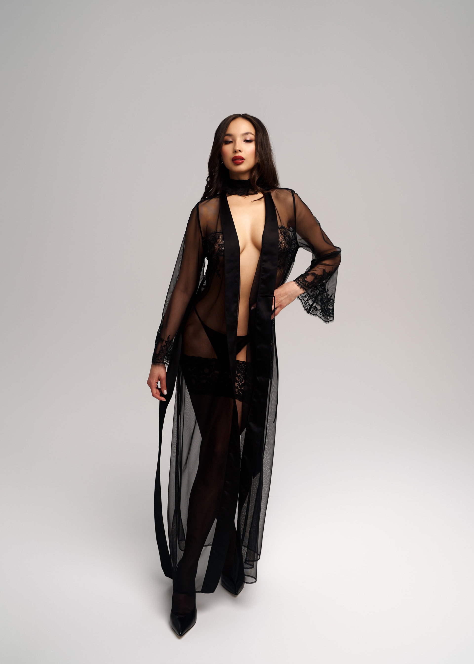 Длинный полупрозрачный пеньюар из черной сетки в сочетании с цветочным кружевом. Отделка из шелковистого атласа.
